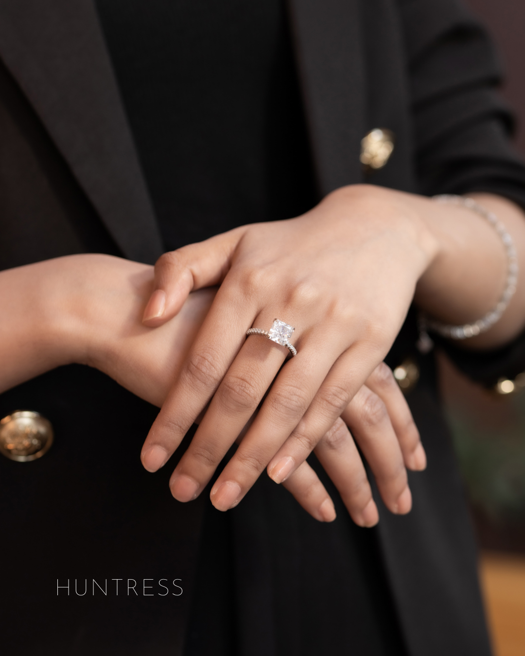 An iconic masterpiece featuring a striking square radiant cut stone at its center.